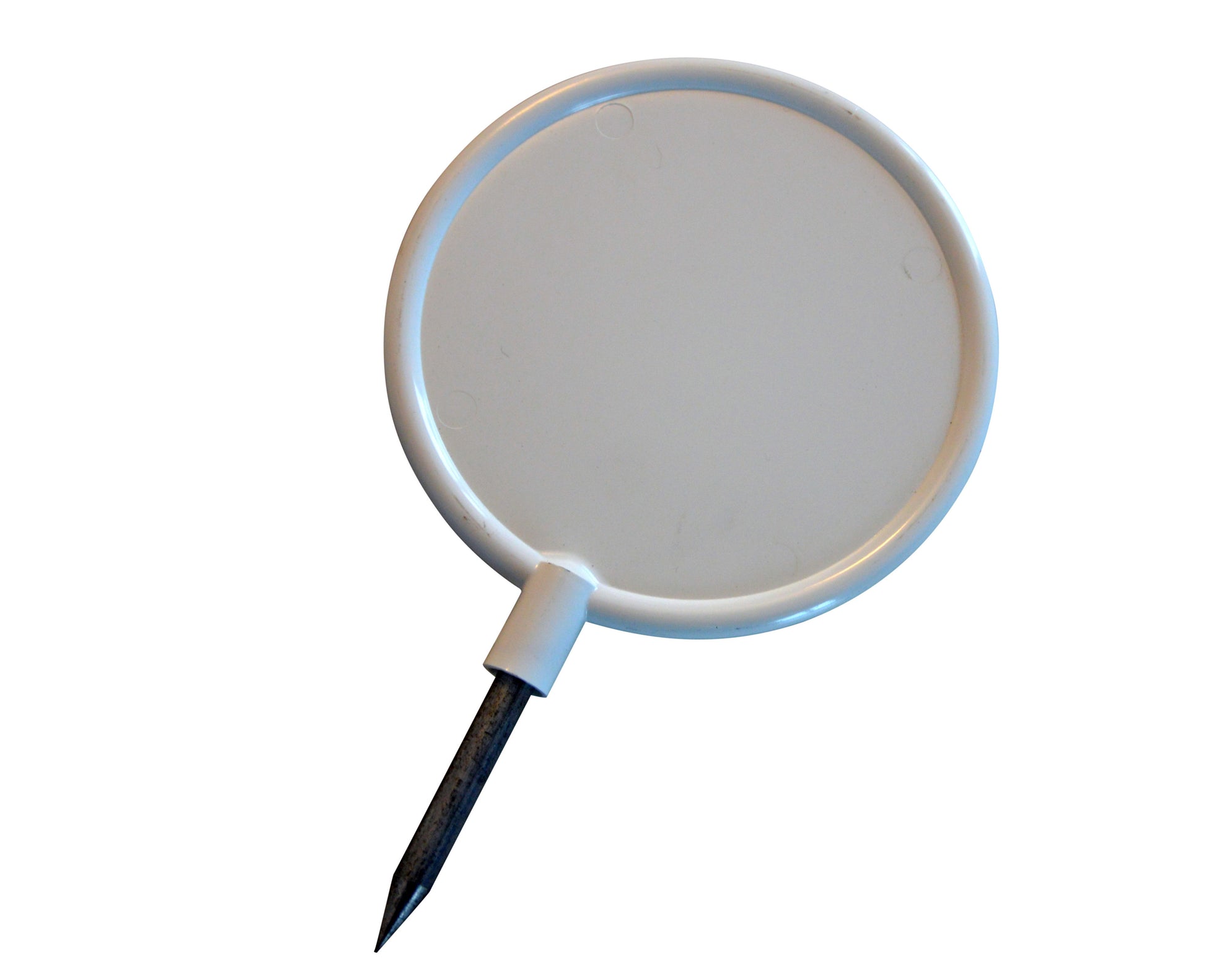 Disc round white tee marker in impact-resistant plastic. 12 cm (4.7") in diameter with 8 cm (3.2") aluminium tip.